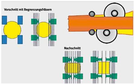 | Anforderungen an Rückschlaggreifer | Über die gesamte Schnittbreite reichend und rechts und links mindestens ein Greifer zusätzlich | Über die gesamte Einschubbreite reichend | Über die gesamte Einschubbreite reichend | |