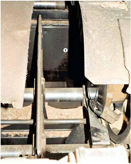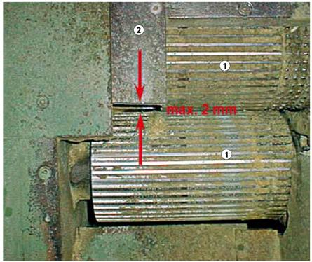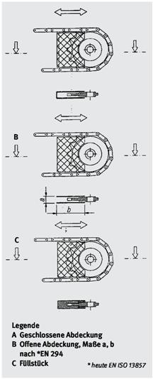 | Oberhalb des Tisches zwei seitlich versetzte Reihen des Typ 1 oder eine Kombination von Typ 1 mit Typ 2 über die gesamte Einschubbreite. Wenn eine Reihe der Greiferrückschlagsicherung den Anforderungen an die Splitterfänger des Typ 1 entspricht, kann eine Reihe Splitterfänger des Typ 1 entfallen | Rückschlagsicherung muss auch zurückfliegende Splitter auffangen. Gliederbreite 8-10 mm und dazwischen Scheiben bis max. 1 mm Dicke | Splitterfangeinrichtung seitlich und eine über den gesamten Einschubbereich. Ab Bj. 1989 gemäß ZH 1/3.18 zwei Splitterfangeinrichtungen von oben | Die Rückschlagsicherung über die gesamte Einschubbreite muss auch zurückfliegende Splitter auffangen | |