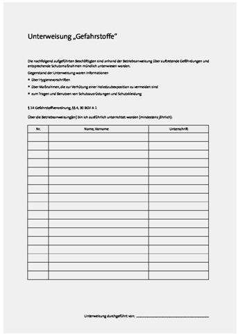 Die nachfolgend aufgeführten Beschäftigten sind anhand der Betriebsanweisung über auftretende Gefährdungen und entsprechende Schutzmaßnahmen mündlich unterwiesen worden.