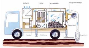 Alle Medien sind saugbar. Dabei können sogar faustgroße Steine (feste Partikel bis zu einem Durchmesser von 250 mm) mitgerissen werden. Im Sammelraum erfolgt dann die Abla0gerung aller größeren Partikel. Über Abscheidekammern und Filter wird der Luftstrom weiter gereinigt und getrocknet. Über die Feinstfiltereinheit werden letzte Stäube absorbiert. Die gereinigte Luft wird großflächig über eine Schalldämmeinheit nach oben ausgestoßen.