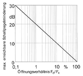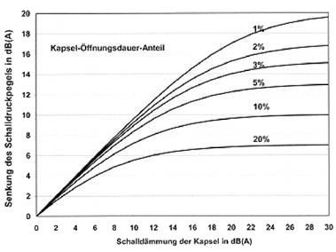 In Bild 4 ist der Einfluss der Öffnungsdauer auf die maximal erreichbare Pegelminderung für Kapseln mit Schalldämmmaßen bis zu 30 dB dargestellt (das Diagramm beruht auf der Annahme einer vollständigen Öffnung der Kapsel entsprechend einer Schalldämmung von 0 dB). Aus diesem Bild lässt sich ablesen, dass der maximal erreichbare Lärmminderungserfolg durch den Öffnungsdaueranteil begrenzt ist, z.B. bei einer zu 10 % der Arbeitszeit offenstehenden Kapsel auf 10 dB. In diesem Fall wird mit einer hochdämmenden Kapsel mit 30 dB Schalldämmung praktisch derselbe Lärmminderungserfolg erreicht wie mit einer einfacheren Kapsel mit 20 dB Schalldämmung. Unter Berücksichtigung dieser in Bild 4 dargestellten Zusammenhänge empfiehlt es sich deshalb zu prüfen, welche Anforderungen an die Schalldämmung der Kapsel unter den gegebenen Bedingungen sinnvoll sind.
