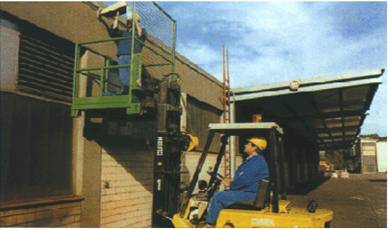 Bild 3-7: Arbeitsbühne am Stapler (Hinweis: Korb mit dreiteiligem Seitenschutz und Schutzgitter, formschlüssig am Gabelstapler befestigt, Fahrer während des Einsatzes auf dem Stapler)