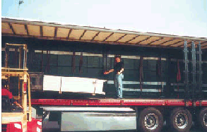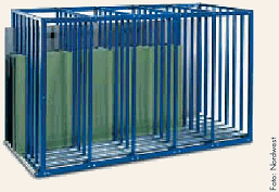 Flächenförmiges Lagergut, z.B. Flachglas, Bleche, Span- und Tischlerplatten, Fenster, Türen bei senkrechter Lagerung in Gestellen oder durch Rungen sichern.