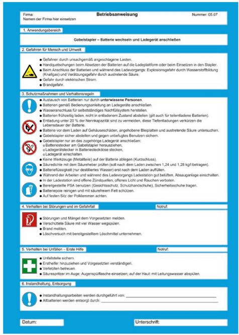 Es sind generell Betriebsanweisungen zu erstellen, die neben dem Umgang mit Batterieladeeinrichtungen auch die örtlichen Gegebenheiten und Randbedingungen berücksichtigen. Diese sind im Arbeitsbereich gut sichtbar anzubringen und in geeigneter Weise bekannt zu geben.