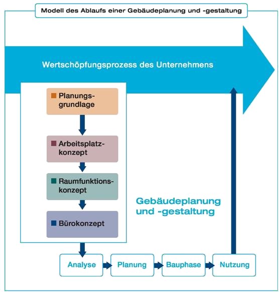 Diese Broschüre orientiert sich an dem unten abgebildeten "Modell der Büroraumplanung" (siehe 2.2). Dieses Modell ermöglicht eine systematische Vorgehensweise bei der Planung und Gestaltung von Büroräumen und -gebäuden.