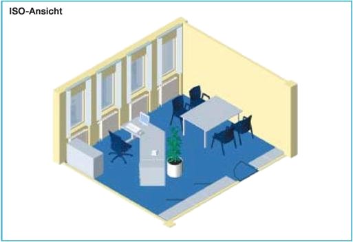 Die folgenden Beispiele zeigen, wie die in Kapitel 2 beschriebenen Hinweise zur Büroraumgestaltung realisiert werden können. Die Beispiele geben Anregungen für die Möblierung und die Anordnung der Arbeitsplätze in Büroräumen. Sie werden als Grundriss und als perspektivische Ansicht (ISO-Ansicht) dargestellt.