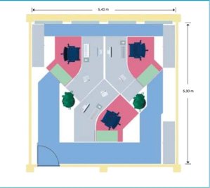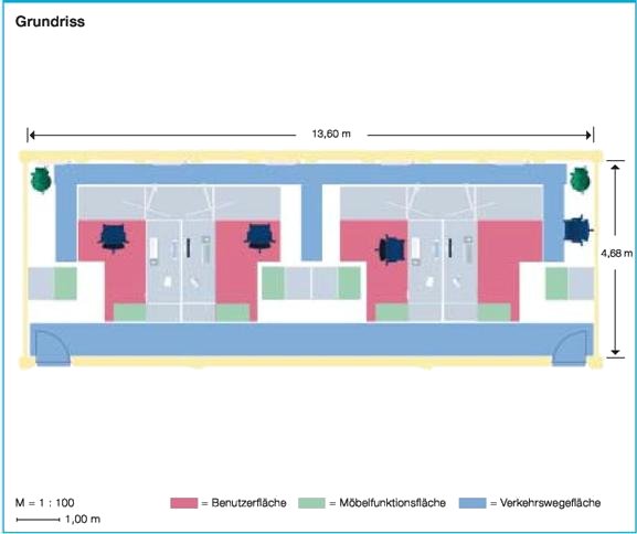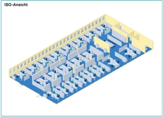 Die Arbeitsplätze können je nach Projektarbeit zu unterschiedlich großen Arbeitsplatzgruppen zusammengefasst werden. Wegen der Schrägaufstellung der Bildschirme zur Fensterfront muss besonders auf geeigneten Sonnenschutz zur Blendungsbegrenzung geachtet werden. Durch die örtliche Nähe von Pausenbereich und Technikbereich wird die informelle Kommunikation unter den Mitarbeitern gefördert.