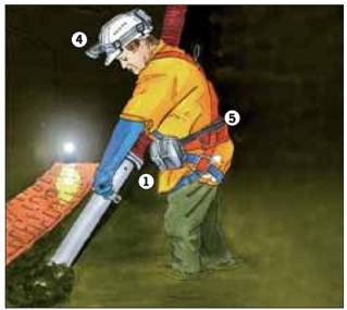 Beim Geräteeinsatz im ungesicherten Bereich Arbeitsplätze mit Schutzaufbauten (Schutzdach, Frontgitter) gegen hereinbrechendes Gebirge sichern.
