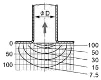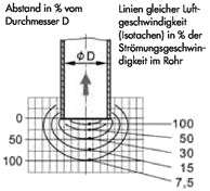 Die Abbildung 3 macht deutlich, dass mit zunehmendem Abstand von der Erfassungseinrichtung die Luftgeschwindigkeit und damit das Erfassungsvermögen stark abnimmt. Bereits im Abstand eines Rohrdurchmessers beträgt die Luftgeschwindigkeit nur noch 7,5 % der Luftgeschwindigkeit im Rohr.