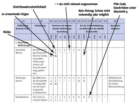Grundsätzlich kann für die in Tabelle 3 aufgelisteten Gefahren ein Durchschnittswert für die Häufigkeit angegeben werden, mit der diese Gefahren in Bezug auf die angegebenen Einsatzszenarien (siehe Tabelle 1) auftreten. Mit steigendem Risiko wächst jedoch die Anforderung an den Träger der Schutzkleidung hinsichtlich des taktischen Verhaltens und der Kenntnis über Anwendung und Grenzen der gesamten PSa im Einsatzfall.
