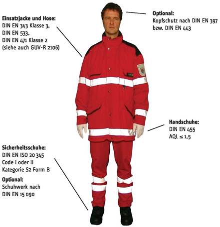 * Sofern eine extreme Wärmebelastung oder die Gefahr einer Durchzündung ausgeschlossen werden können, bietet eine Einsatzhose nach EN 469 Leistungsstufe 1 hinreichenden Schutz, da letale Verletzungen nicht zu erwarten sind.