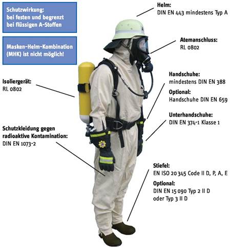 Ausrüstung: siehe unten, Isoliergerät oder Atemanschluss sind durch die Außenlage nicht gegen Chemikalien geschützt.