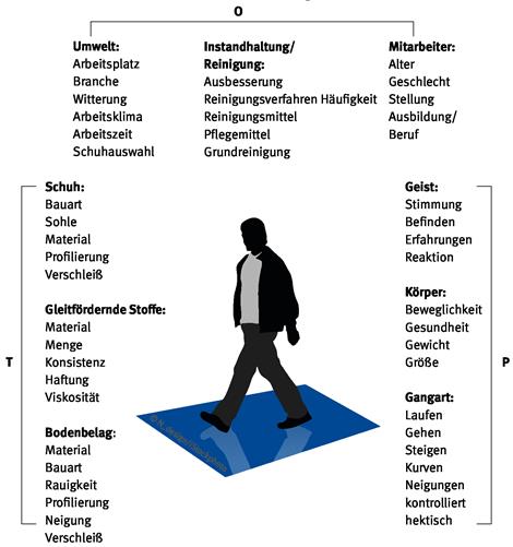 Einflussgrößen der Rutschhemmung sind u. a. der Bodenbelag, die gleitfördernden Stoffe, die Reinigung und die dabei verwendeten Reinigungsmittel, die Schuhe, das Verhalten beim Gehen sowie weitere Umgebungsparameter (siehe Bild 1).