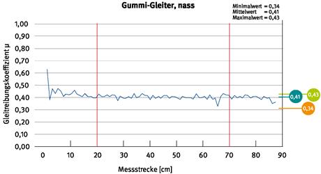 Anmerkung: Auf sehr glatten Oberflächen (z.B. hochglanzpoliertem Steinzeug) kann es zu einem "Ansaugen" der Gleiter kommen und dadurch zu einem hohen µ-Wert, der der tatsächlich geringen Rutschhemmung nicht entspricht. |