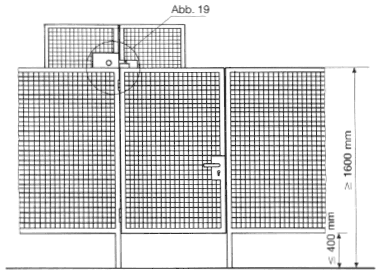 4.5.3.1 Umzäunungen müssen mindestens 1,60 m hoch sein; ihre Unterkante darf höchstens 0,40 m über der Zugangsebene liegen (siehe Abbildung 18).