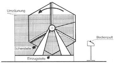 An Sternpressen mit kraftbetriebener Drehbewegung müssen Quetsch- und Scherstellen, Fangstellen und Einzugstellen, die durch die Drehbewegung entstehen, durch eine Umzäunung gesichert sein (siehe Abbildung 19). Die Anordnung der Umzäunung ist abhängig von der Drehrichtung.