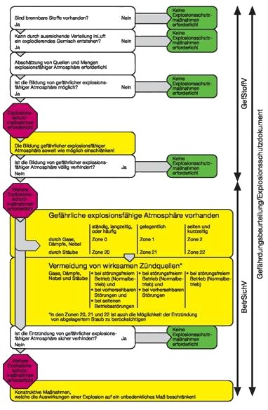 Zur Gefährdungsbeurteilung siehe § 5 des Arbeitsschutzgesetzes und § 7 der Gefahrstoffverordnung sowie § 3 der Betriebssicherheitsverordnung.Zur systematischen Vorgehensweise zum Erkennen und Vermeiden von Explosionsgefährdungen siehe das Abfrageschema in Anhang 1 und Technische Regeln für Betriebssicherheit TRBS 2152 "Gefährliche explosionsfähige Atmosphäre; Allgemeines". Zur Beurteilung der Explosionsgefährdung "siehe auch Technische Regeln für Betriebssicherheit TRBS 2152 Teil 1 "Gefährliche explosionsfähige Atmosphäre; Beurteilung der Explosionsgefährdung".