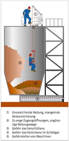 Besondere Gefährdungen durch Einrichtungen können z.B. in Behältern, Silos und engen Räumen bestehen oder entstehen durch:
