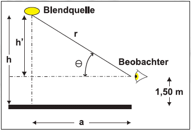 Bild 1: Schematische Darstellung zur Berechnung und Messung der mittleren vertikalen Beleuchtungsstärke in einem Punkt zur näherungsweisen Bestimmung der zylindrischen Beleuchtungsstärke