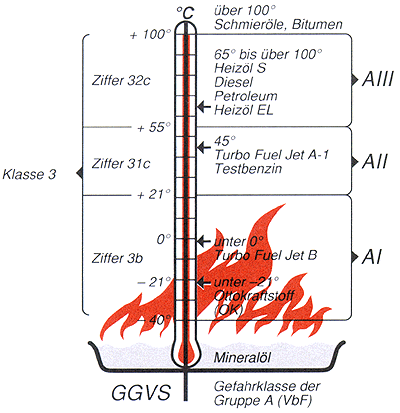 | Flammpunkt | Gefahrklasse nach VbF | Bezeichnung nach GGVSE |
