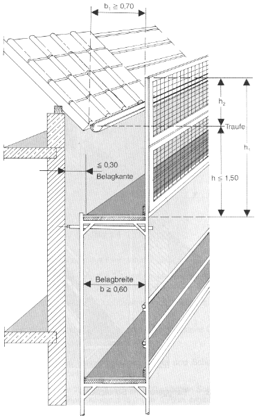 6.3.1 Der Belag des Dachfanggerüstes darf nicht tiefer als 1,50 m unter der Traufe liegen (siehe Bild 4).