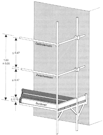 7.3.1.1 Belagflächen müssen mit einem Seitenschutz, bestehend aus Geländerholm, Zwischenholm und Bordbrett (siehe Bild 6), umwehrt sein.
