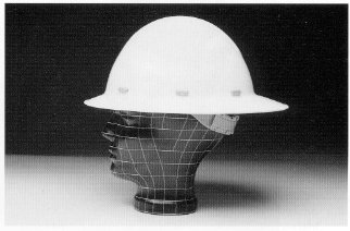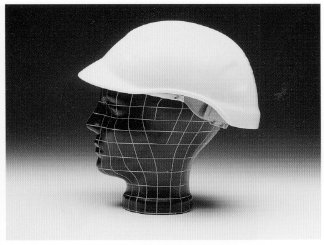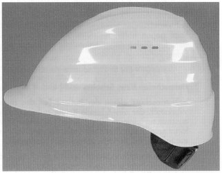 Bild 2: Industrieschutzhelm mit heruntergezogenem Nackenteil, Belüftungsöffnungen und seitlichen Schlitzen zur Befestigung von Zubehör (z.B. Gehörschützer), jedoch ohne Regenrinne