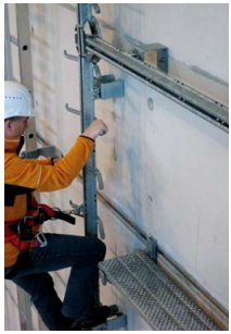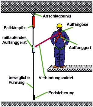Der Auffanggurt wird durch ein Verbindungselement oder ein Verbindungsmittel mit angefügtem Verbindungselement mit dem mitlaufenden Auffanggerät verbunden. Im Sturzfall arretiert das mitlaufende Auffanggerät an der beweglichen Führung und hält die zu sichernde Person. Bild 2: Beispiel des Auffangsystems mit einem mitlaufenden Auffanggerät einschließlich beweglicher Führung