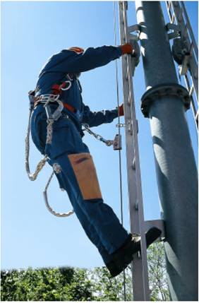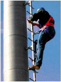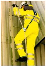 5.3.4 Mitlaufende Auffanggeräte einschließlich beweglicher Führung nach DIN EN 353-2 Mitlaufende Auffanggeräte bilden mit der vom Hersteller mitgelieferten beweglichen Führung (Chemiefaserseil/ Drahtseil) eine verwendungsfertige Einheit. Die bewegliche Führung hat am freien Ende eine Seilendsicherung, die ein Trennen des Gerätes von der Führung verhindert. Es gibt auch mitlaufende Auffanggeräte, die sich an beliebiger Stelle der beweglichen Führung anschließen und lösen lassen. Die sichere Funktion ist nur dann gewährleistet, wenn das mitlaufende Auffanggerät an der vom Hersteller vorgegebenen beweglichen Führung angeschlossen wird. Darüber hinaus dürfen nur die vom Hersteller vorgesehenen Verbindungsmittel bzw. Verbindungselemente als Zwischenverbindung von Auffanggurt und Auffanggerät verwendet werden Bild 14: Mitlaufendes Auffanggerät an beweglicher Führung. Hier bildet der Falldämpfer das Verbindungsmittel zum Auffanggurt