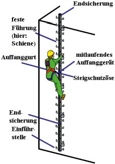 5.3.7 Mitlaufende Auffanggeräte einschließlich fester Führung nach DIN EN 353-1 (Steigschutzeinrichtungen) Steigschutzeinrichtungen gibt es mit unterschiedlichen Führungen, z.B. Schienen oder Drahtseil (siehe Bild 20). Für das Auf- bzw. Absteigen ist generell eine Entriegelung der Sperrvorrichtung (verhindert das Abrutschen des Gerätes an der Führung) des Auffanggerätes erforderlich. Dies erfolgt entweder mit oder ohne horizontale Zugkraft, die z.B. durch Zurücklehnen des Benutzers beim Steigen aufgebracht wird. In der Praxis finden, insbesondere unter Berücksichtigung der ergonomischen Vorteile beim Überwinden von großen Höhen und Tiefen, vorzugsweise Steigschutzeinrichtungen Akzeptanz und Anwendung, deren Auffanggeräte mit horizontaler Zugkraft entriegelt werden. Bei engen Umgebungsbedingungen, wie z.B. in Schächten, haben sich dagegen Auffanggeräte bewährt die ohne horizontale Zugkraft entriegelt werden. Die Länge der Zwischenverbindung von vorderer Auffangöse bzw. Steigschutzöse des Auffanggurtes und dem Auffanggerät ist vom Hersteller vorgegeben und darf nicht verändert werden. Die Führungen sind in der Regel mit Endsicherungen ausgestattet. Befinden sich Ein- bzw. Ausstiegsstellen in einem absturzgefährdeten Bereich verhindern die Endsicherungen ein unbeabsichtigtes Verlassen der Führung. Die Ausstattung der Steigschutzeinrichtungen ist je nach Hersteller mit folgenden Zubehörteilen möglich:
