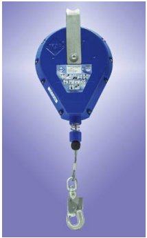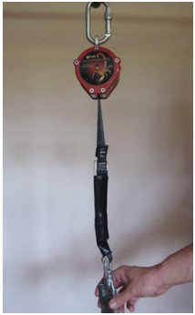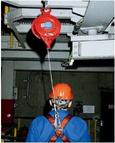 Es gibt Falldämpfer die als Verbindungsmittel ausgeführt sind (siehe Bild 12). 5.3.6 Höhensicherungsgeräte nach DIN EN 360 Höhensicherungsgeräte haben ein einziehbares Verbindungsmittel aus Drahtseil, Gurtband oder Chemiefaserseil. Es werden Geräte von 2,0 m bis zu 60 m Verbindungsmittel-Auszugslänge angeboten. Soweit Höhensicherungsgeräte in Standplatzebene angeschlagen sind, so sind nur optional für die zu erwartende Kantenbeanspruchung geprüfte Geräte geeignet. Geräte, die mit einem Karabinerhaken mit Wirbel ausgestattet sind gewährleisten, dass sich das Verbindungsmittel nicht verdreht (siehe Bilder 18 und 19). Es gibt auch Höhensicherungsgeräte, die gleichzeitig mit einer Rettungshubeinrichtung ausgestattet sind (siehe hierzu auch BGR/GUV-R 199). Bild 18: Höhensicherungsgerät mit Verbindungsmittel aus Drahtseil