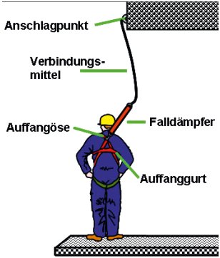 Der Auffanggurt ist mit einem Verbindungselement des ein- und ausziehbaren Verbindungsmittels des Höhensicherungsgerätes verbunden. Im Sturzfall arretiert das Höhensicherungsgerät mittels integrierter Bremsvorrichtung und hält die zu sichernde Person. 3.4 Auffangsystem mit Falldämpfer Das System besteht aus Anschlagpunkt, Verbindungsmittel, Falldämpfer und Auffanggurt. Bild 7: Skizze des Auffangsystems mit Falldämpfer