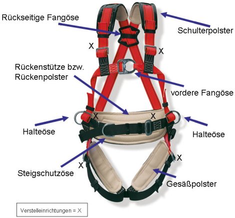 Zusätzlich sind die ergonomischen Besonderheiten der kombinierten persönlichen Schutzausrüstungen in ihrer Gesamtheit zu betrachten, um eine Überbelastung des Trägers, z.B. durch das Gesamtgewicht der persönlichen Schutzausrüstungen, das Umgebungsklima oder die Arbeitschwere, zu vermeiden. 5.3.1.6 Ein System mit einem Höhensicherungsgerät ist für Arbeiten über Stoffen, in die man versinken kann, unzulässig. Höhensicherungsgeräte funktionieren nur bei bestimmten Auszugsgeschwindigkeiten, die beim Versinken in Stoffen nicht erreicht werden. 5.3.1.7 Zum Schutz gegen Absturz von Personen dürfen Bergsteigerausrüstungen nur dann eingesetzt werden, wenn diese Ausrüstungen auch den einschlägigen Normen für PSa gegen Absturz entsprechen. Beispiel: Ein Anseilgurt nach DIN EN 12277 muss demzufolge auch DIN EN 361 entsprechen. 5.3.2 Auffanggurte nach DIN EN 361 Auffanggurte sind mit hinterer und/oder vorderer Auffangöse ausgestattet. Auffanggurte mit hinterer Auffangöse sind für Arbeiten geeignet, bei denen sich der Anschlagpunkt oberhalb oder hinter der zu sichernden Person befindet. Auffanggurte mit vorderer Auffangöse sind für Arbeiten geeignet, bei denen sich der Anschlagpunkt oberhalb oder vor der zu sichernden Person befindet. Sie sind besonders geeignet, wenn die Gefahr des Anprallens besteht. Für die Verwendung in Steigschutzsystemen gibt es auch Auffanggurte mit einer mittig am Bauchgurt angeordneten Steigschutzöse (siehe Bilder 4 und 10). Auffanggurte können in Kleidungsstücke integriert sein. Sie können auch mit extra breiten, gepolsterten Gurtbändern sowie mit integrierten bzw. zusätzlichen Rückenstützen ausgestattet sein. Auffanggurte, die für die Verwendung in Haltesystemen bestimmt sind, besitzen zusätzliche seitliche Halteösen. Diese sind ausschließlich für Halte- und nicht für Auffangfunktionen geeignet. Für diejenigen Versicherten, für die die Sicherung gegen Absturz zur Arbeitscharakteristik gehört, ist ein Auffanggurt zur Verfügung zu stellen der dem Versicherten zur alleinigen Benutzung zusteht. Bild 10: Beispiel eines Auffanggurtes mit vorderer und rückseitiger Auffangöse, seitlichen Halteösen und einer Steigschutzöse. Der Gurt ist zusätzlich mit Schulter-, Beingurt, und Rückenpolstern ausgestattet