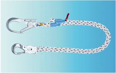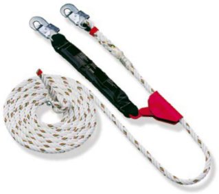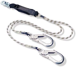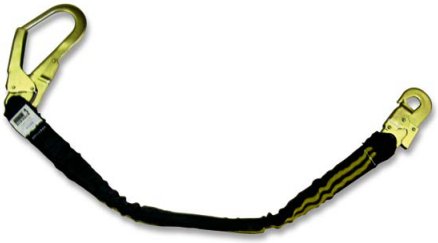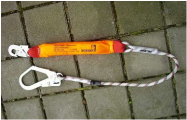 Zur Vermeidung der Gefahr der Schlaffseilbildung empfehlen sich Verbindungsmittel mit einer Einstellvorrichtung für die Verbindungsmittellänge. Soweit mit erhöhter Schmutzeinwirkung oder UV-Strahlung zu rechnen ist, sind Verbindungsmittel aus geflochtenen Seilen (Kernmantelseile) zu bevorzugen. Auf Grund des schützenden Mantels bleibt der überwiegende tragende Kern des Seiles vor äußeren Einwirkungen weitgehend geschützt. Es gibt Verbindungsmittel mit integriertem Falldämpfer (siehe hierzu Bilder 15 und 17). Diese Verbindungsmittel sind verwendungsfertig und dürfen in ihrer Länge durch Anfügen zusätzlicher Bestandteile nicht verändert werden. Dies gilt auch für Verbindungsmittel mit energieabsorbierenden Eigenschaften (siehe Bild 12). Zum Fortbewegen unter Absturzgefahr eignen sich zweisträngige Verbindungsmittel mit integriertem Falldämpfer (siehe Bild 13). Dabei ist der Falldämpfer immer direkt an der Auffangöse des Auffanggurtes anzuschlagen. Bild 12: Verbindungsmittel mit energieabsorbierenden Eigenschaften
