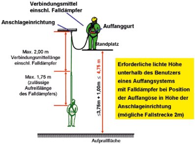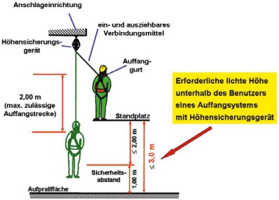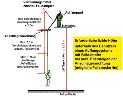 5.3 Hinweise für die Auswahl 5.3.1 Allgemeines 5.3.1.1 Der Unternehmer hat gemäß § 2 der PSA-Benutzungsverordnung den Versicherten geeignete persönliche Schutzausrüstungen bereitzustellen; vor der Bereitstellung hat er die Versicherten anzuhören 5.3.1.2 Bei der Auswahl der Auffangsysteme ist die erforderliche lichte Höhe unterhalb des Standplatzes des Benutzers zu beachten. Genaue Angaben dazu sind in der Gebrauchsanleitung des Herstellers aufgeführt. Die erforderliche lichte Höhe errechnet sich aus der jeweiligen Auffangstrecke und einem Sicherheitsabstand von 1 m. Der Sicherheitsabstand berücksichtigt u. a. das Verschieben der Auffangöse am Gurt und die Dehnung des Gurtmaterials (siehe nachfolgende Beispiele). Beispiel 1: