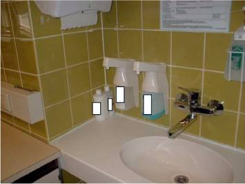 Beispiel eines Händewaschlatzes (Hinweis: Auswahl zufällig; auch vergleichbare Desinfektionsmittelspender und Einhebel-Armaturen sind geeignet