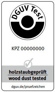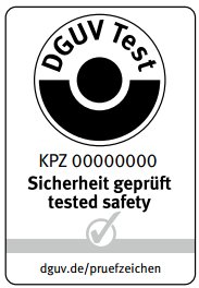 Das DGUV Test-Zeichen ist gegebenenfalls mit einem Zusatz entsprechend den Angaben auf dem Zertifikat zu versehen. Bei Zertifikaten mit ergänzenden Zusätzen weicht das Aussehen von dem Muster ab.