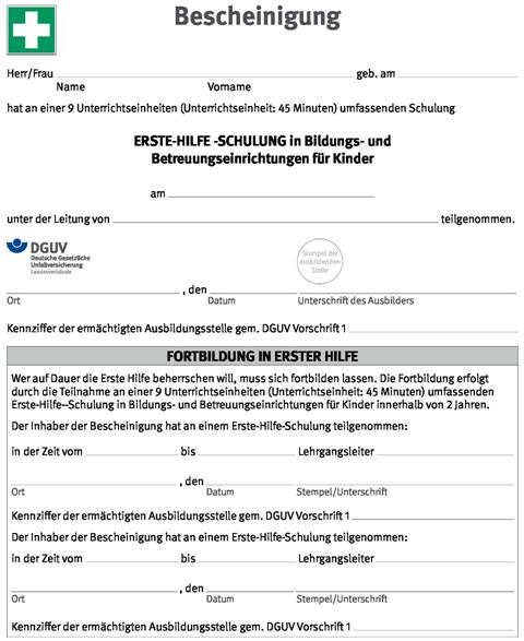| Muster einer Teilnahmebescheinigung Erste-Hilfe-Schulung in Bildungs- und Betreuungseinrichtungen für Kinder | Anhang 7 |