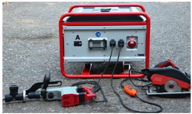 Abb. 27 Drei Betriebsmittel - Baustellenkreissäge direkt angeschlossen, Abbruchhammer und Winkelschleifer hinter jeweils einem Trenntransformator betrieben