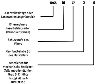 Diese Brillen dienen dem Schutz der Augen gegen Laserstrahlung für die jeweils betreffenden Wellenlänge(n) im ultravioletten, sichtbaren und infraroten Spektralbereich für mindestens 10 s.