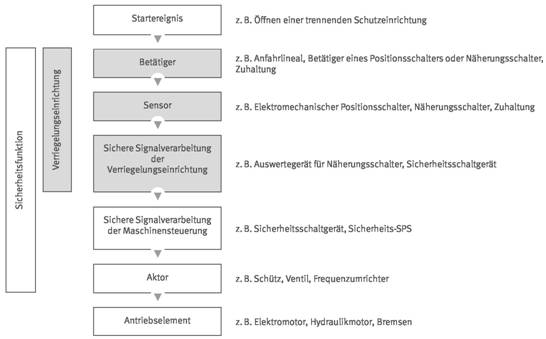 Eine Verriegelungseinrichtung besteht im Allgemeinen aus einem Betätiger, einem Sensor (z.B. elektromechanischer Positionsschalter), ggf. einer Zuhaltung und der sicheren Signalverarbeitung der Verriegelungseinrichtung. Das in Abbildung 1 dargestellte Zusammenwirken von der Schutzeinrichtung, der Stellungsüberwachung mittels Sensor über sicherheitsrelevante Steuerungsteile bis zum Abschalten von Leistungssteuerelementen stellt ein typisches Beispiel für die Wirkungskette einer Sicherheitsfunktion an einer Maschine dar (siehe auch DIN EN ISO 13849-1 [ 9]). Die steuerungstechnische Sicherheitsfunktion wäre hier das sichere Stillsetzen eines Antriebs durch das Abschalten von Leistungssteuerelementen nach dem Öffnen einer trennenden Schutzeinrichtung. Mit welcher Qualität und Zuverlässigkeit dies passieren muss, hängt von der Risikobeurteilung an der potentiellen Gefahrstelle ab.
