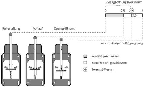 Die wichtigste Eigenschaft eines elektromechanischen Positionsschalters für Sicherheitsfunktionen ist die sog. Zwangsöffnung, welche im Abschnitt 3.3.2 näher erläutert wird.