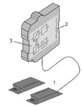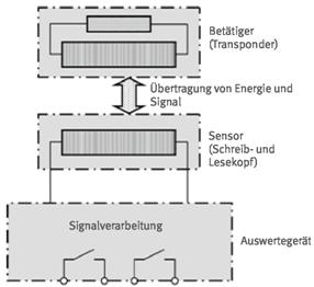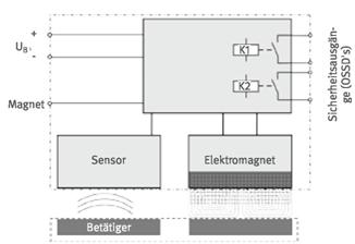 Zum Näherungsschalter für Sicherheitsfunktionen gehören die Baugruppen Sensor (aktives Teil), Auswertegerät inklusive den Sicherheitsausgängen (OSSD's) und der Betätiger (festgelegtes Objekt).