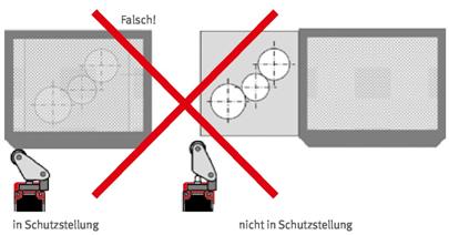 Entsprechend der Risikobeurteilung kann zur Erfüllung der sicheren Funktion einer Verriegelungseinrichtung die Verwendung von zwei Positionsschaltern an einer Schutzeinrichtung erforderlich sein, wobei mindestens einer davon so angebracht sein muss, dass er zwangsöffnend wirkt (siehe hierzu auch Abschnitt 6).