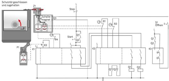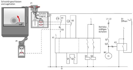Verriegelungseinrichtungen einschließlich der nachfolgenden Signalverarbeitung sind sicherheitsbezogene Teile der Steuerung von Maschinen. Damit fallen sie unter den Anwendungsbereich von DIN EN ISO 13849-1 [ 9] bzw. DIN EN 62061 [ 11]. Die im Folgenden betrachteten Ausführungen und Schaltungsbeispiele beziehen sich auf die DIN EN ISO 13849-1 [ 9].