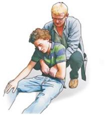 Fassen Sie am Boden Liegende von hinten kommend unter Nacken und Schultern, und bringen Sie sie zum Sitzen. Achten Sie darauf, dass Sie den Kopf mit Ihren Unterarmen stützen und Betroffene nicht seitlich wegsacken (1). |
