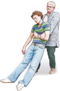 Fassen Sie die verletzte Person wie abgebildet und ziehen Sie ihn vorsichtig aus dem Fahrzeug. Dabei ist es von Vorteil, wenn ein zweiter Helfer unterstützend die Beine des Verunglückten hält. |