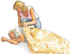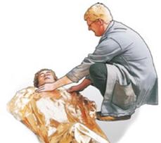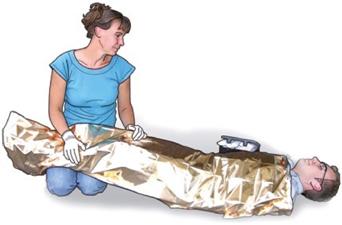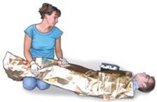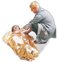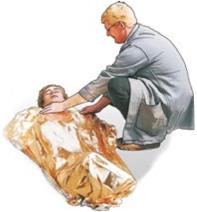 Danach sprechen Sie die betroffene Person erneut an. Decken Sie sie z.B. mit einer Rettungsdecke zu. Silberne Seite grundsätzlich zur betroffenen Person. Betreuen Sie sie, bis der Rettungsdienst eintrifft (4). Kinder werden zur Rettung aus einer Gefahrenzone einfach auf den Arm genommen. |
