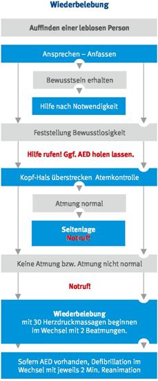 Wiederbelebung ist immer dann notwendig, wenn durch einen Unfall, eine akute Erkrankung oder eine Vergiftung die Lebensfunktionen - Bewusstsein, Atmung und Kreislauf - ausfallen. Hier zählt jede Sekunde. Die Maßnahmen in diesem Kapitel sollte man gut geübt haben, dazu ist die Teilnahme an einem Erste-Hilfe - Kurs zwingend notwendig.