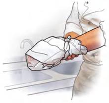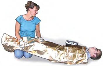 Besonders vorteilhaft sind die im Verbandkasten vorhandenen Rettungsdecken (Silberseite innen, Goldseite außen). Beachten Sie, dass die Rettungsdecke beim Entfalten sehr geräuschvoll ist, was das Kind in der ohnehin belastenden Situation erschrecken könnte.